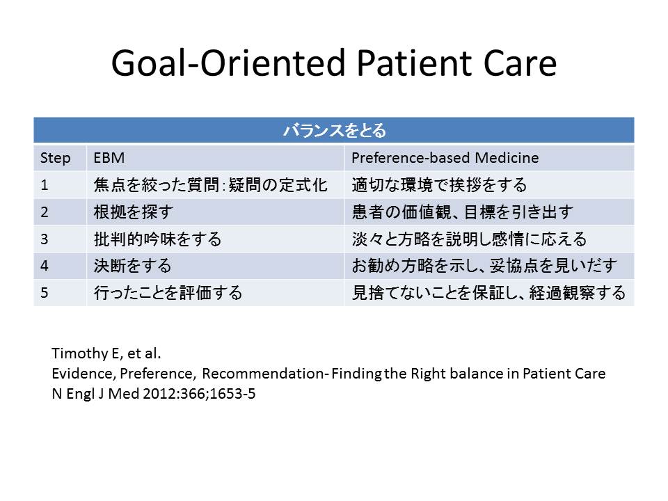 EBMが重要視されているが、それだけでは不十分であり、患者の価値観・意向を尊重して、バランスのとれた患者ケアが必要であるという論文がニュウ・イングランド・ジャーナル誌に掲載された。