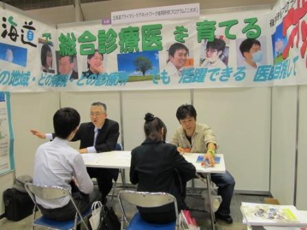 会場の東京ビックサイトでニポポプログラム事務局の日光さんと研修医の阿部医師と合流。12時に説明会が開始となる。最初の1時間は閑古鳥が鳴く状態であったが、その後ぼつぼつと訪問あり。総合内科志望者や北海道が好きという方が多かった。いつものごとく説明の合間の時間に各ブースを訪ね歩く。総合診療関係の指導者や自治医大の同級生と話をすることができた。